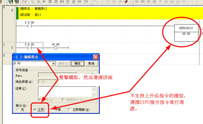 歐姆龍編程軟件里梯形圖編程上升沿微分指令和下降沿微分指令怎么輸入啊?