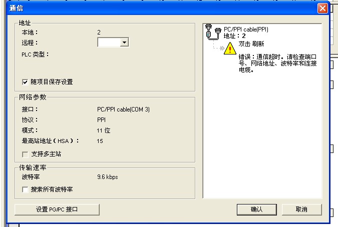 你可以點擊PG/PC那里檢查一下COM端口號是否正確,如正確請檢查電纜及PLC通信端口