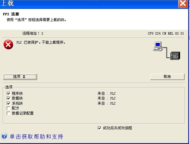 剛才弄一個西門子200的PLC,型號是224CN。通訊以后上載程序提示下圖。但是沒有彈出提示輸入密碼的那個對話框,不知道怎么回事,高手幫幫忙。