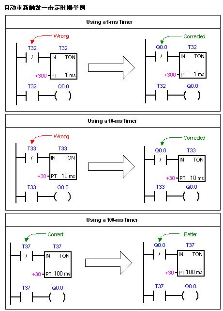 通過使用正常關閉解點Q0.0代替定時器位作為定時器方框的啟用輸入,可保證每次定時器達到預設值時均打開輸出Q0.0進行一次掃描。