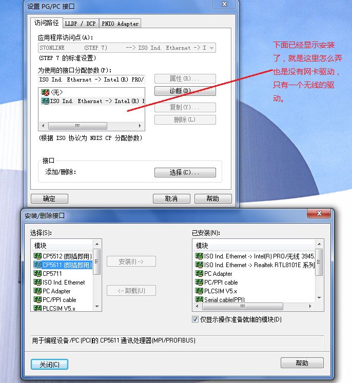 電腦是WIN7旗艦版的,STEP7是V5.5SP2,設置PG/PC的時候對話框根本沒網卡驅動,顯示已經安裝了,但是怎么也沒出來,打電話西門子客服說我系統有問題,現在系統也全換了,還是這個問題,沒有了網卡驅動,現在連接PLC也連不了。以前是XPSP3系統,STEP7換了5.5英文別的版本,還是不行,至于什么的殺毒軟件都沒安裝,看那位師傅有遇到個這樣問題,可以指點下,在此感激不盡?謝謝了。看看下面有圖的?