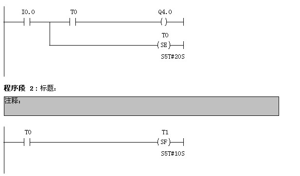 按下啟動按鈕I0.0,Q4.0控制的電機運行20S,然后自動斷電,同時Q4.1控制的制動電磁鐵開始通電,10S后自動斷電。用擴展的脈沖定時器和斷開延時定時器控制電路。