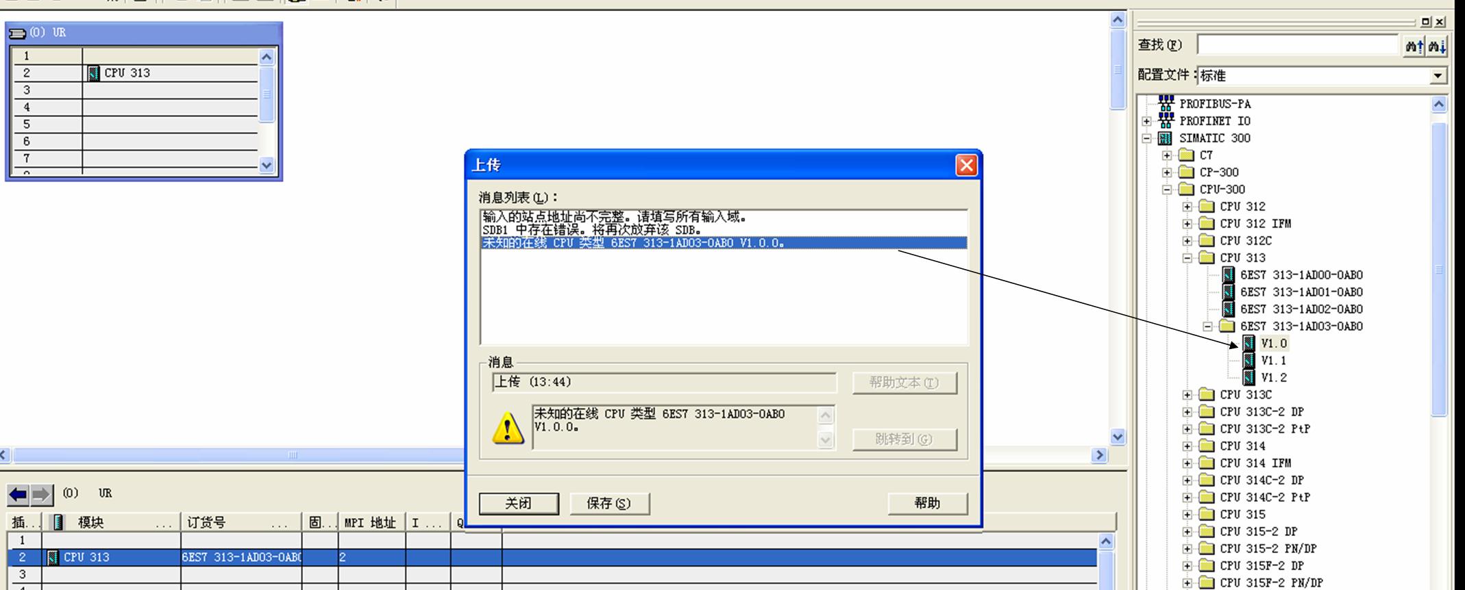 6ES7313-1AD03-0AB0,V1.0,上傳程序時出現(xiàn)未知的CPU類型,但在硬件組態(tài)畫面,有這個CPU型號和版本