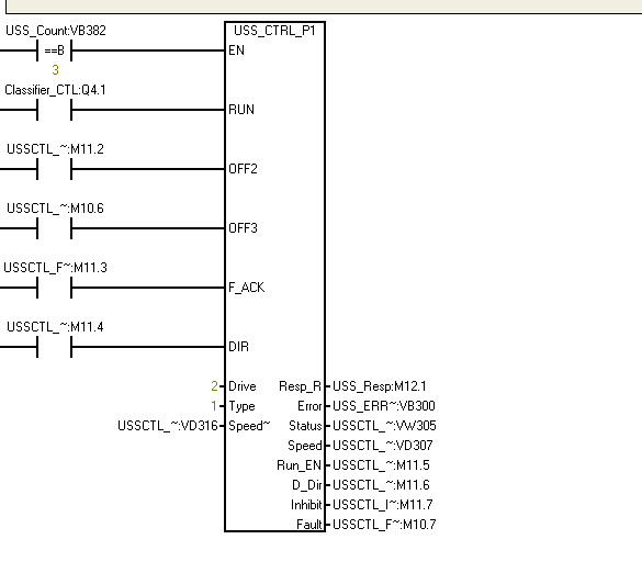 看你這個圖也沒啥用,先檢查P2041,確保在不能停機時候,通信是不是正常的,要是正常,就監視程序,VB382是否等于3,Q4.1是否斷開,要是這些都正常,你就得檢查變頻的命令源在手動跟自動之間是怎么切換的,是不是在不能停機的情況下,命令源壓根就不是通過USS控制的。