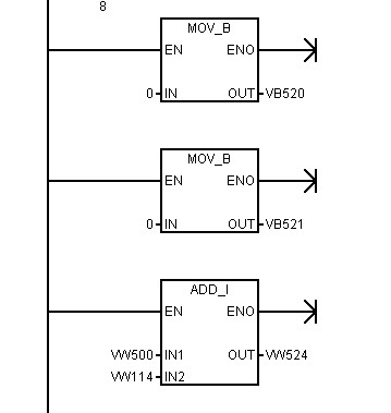 在您貼圖中,In引腳對應的是Source(源),這個可以是Address(地址)也可以是Const(常數),因此,在這里代表的是常數0,也就是對VB520做清零處理,同時下一句是對VB521做清零處理,因為VB520與VB521是連續地址,因此這里可以使用MOV_W指令對VW520做清零,其效果等同。