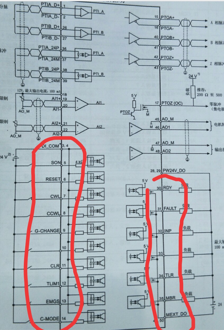 我猜是這樣的,DI_COM:輸入公共點;SON:伺服ON;RESET:復位;CWL:正轉限位;CCWL:反轉限位;RDY:伺服準備好;FAULT:報警;。。。。。好了,就知道這么多,具體得看說明書。 ![]() |