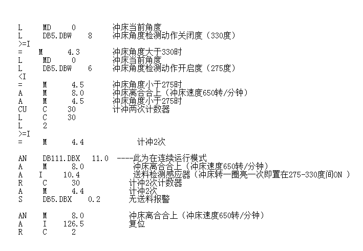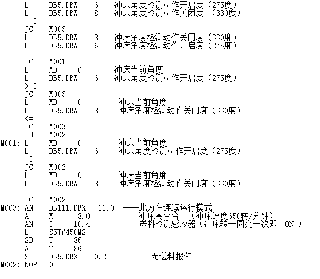 就是有一臺高速沖床,送料報警停機在點動狀態(tài)下報警功能正常,在連續(xù)運行狀態(tài)下剛開機時老是出現送料報警停機假報,程序是別人做的,別人做的程序也是送料報警停機假報無法解決,我現在想改了,可是我改之后也是送料報警停機假報無法解決,還會出現停機延時,一直都沒搞明白,現想改了請各位高手請指點下。送料檢測感應器接外加子網4站輸入點,子站為遠程I/O,以下有硬件組態(tài)圖,別人做的程序和我自己改的
