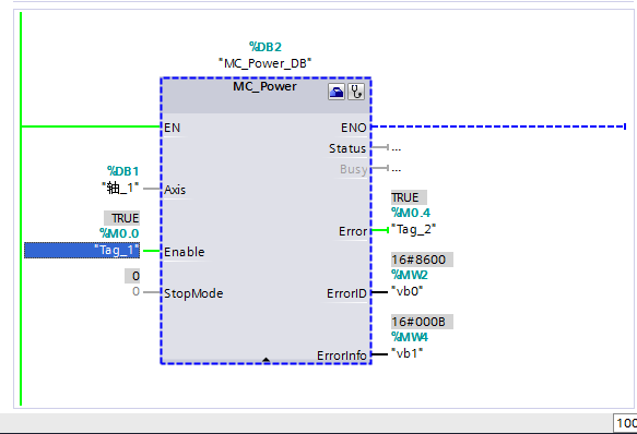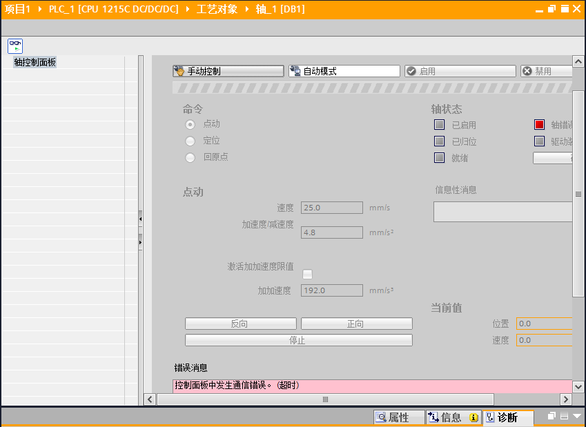用的是博圖V13,配置軸的參數和出現的問題在圖片中。主要是用調試功能切換到手動控制時軸控制面板中發生通訊錯誤,求解。還有就是用程序寫MC_Power時報錯