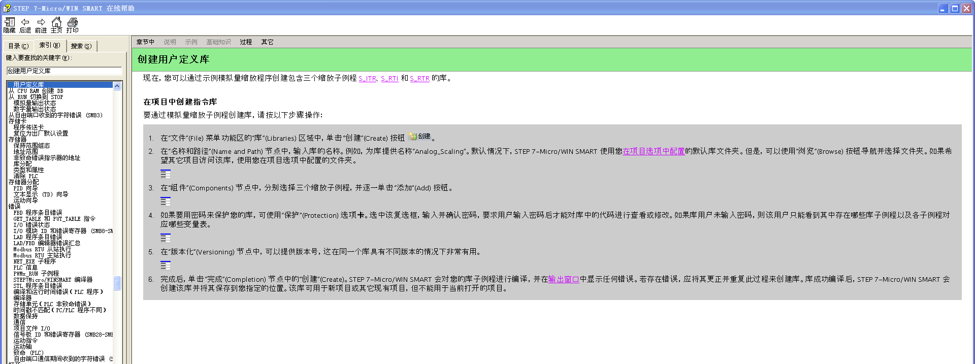 軟件自帶的沒有模擬量整定庫,可以自己編寫一個!可以F1查打開幫助文件,搜索“創建用戶定義庫”,有三個模擬量縮放程序子例程,可以參考直接使用。其中S_ITR子程序就是模擬量轉實數的例程。SMART 200PLC模擬量對頂的AD值是0-27648,如果是4-20mA的話,模擬量AD值是5530-27648.這點需要注意。