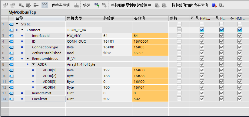后者要分別在DB塊的初始化數(shù)據(jù)中指定主站IP 從站IP. 連接類型TCP/IP 從站主動連接TRUE.