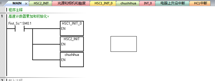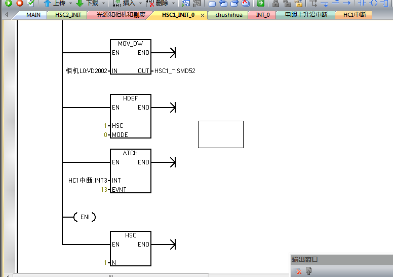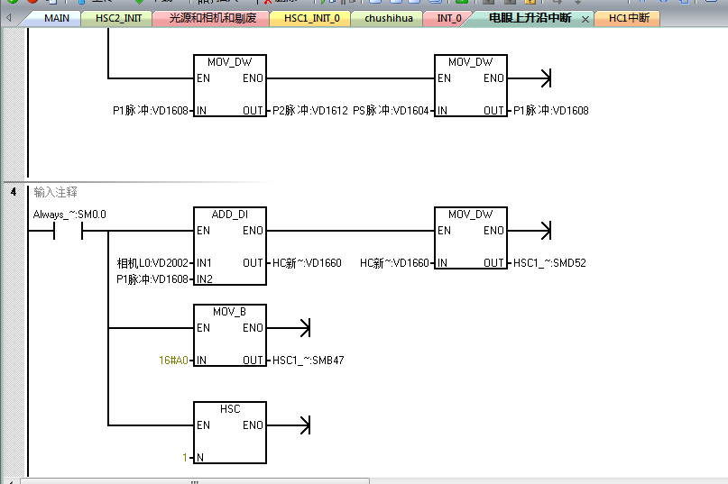 電眼對應I0.0,中斷采用0中斷,也就是電眼發現盒子的時候立即執行中斷程序,中斷程序中采集HC1的數值給VD2000,然后直接賦值為0高速計數器,接著進行數據傳送,最后給HSC1賦新的預設值,在中斷中采用了加法運算,不知道是否可以,,,現象就是我的告訴計數器不知道為什么用這種模式,采集不到數據(排除接線,因為以前的方法直接在主程序采集,都能正常采集數據),還有就是中斷中是否可以包含一些加減乘除的語句,