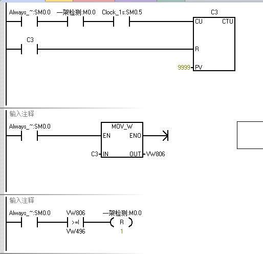 用計數器記秒傳送給VW806,威綸通觸摸屏給VW496設置一個數值,數據格式是UNsigned,用INT比較指令當VW806大于VW496時。復位M0.0。現在情況是設置VW496為75,當VW806等于60時,比較指令就大于VW496里的75了。