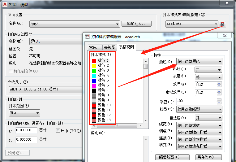 把【表格視圖】里的【打印樣式】中某個顏色或全部顏色選中,然后修改【特性】的顏色【使用對象顏色】為黑色就可以了。