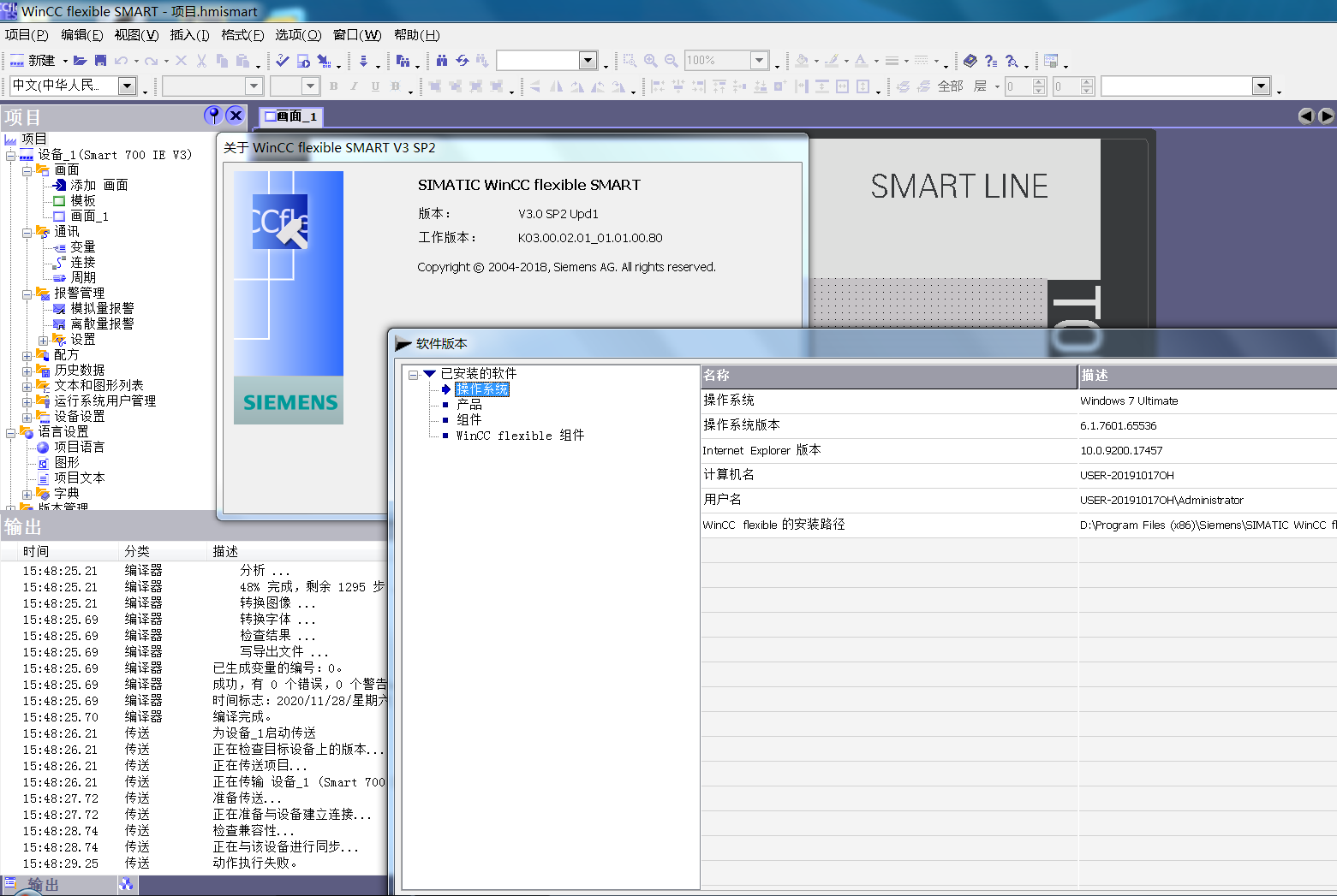 請問各位大師 :wincc flexible smart v3 動作執行失敗,如何處理呢???我也參照西門子官網說法操作也不能解決,什么系統不能有中文名,軟件重新安裝啥的,觸摸屏里面設置什么的都試過了,可下載程序時就報動作執行失敗。。。另外電腦能拼通觸摸屏的IP地址。