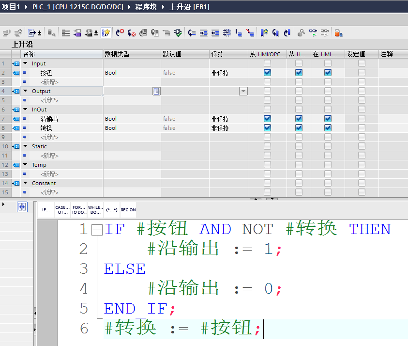 在FB1 做了個上升沿  當(dāng)按鈕信號由0變1時  沿輸出一個掃描周期  不知是不是你想要的    S7-1200有現(xiàn)成的指令