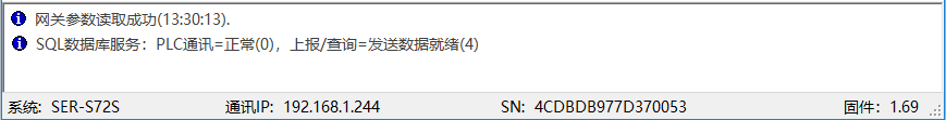 設置完成后通過‘參數’->‘參數寫入到網關’將參數下載到網關,在通過‘工具’->‘重啟網關’重啟,網關就自動進入工作模式。進入工作模式后讀取網關參數‘參數’->‘從網關讀取參數’可查看網關的工作狀態,正常時在消息欄有工作正常的提示,如下圖: