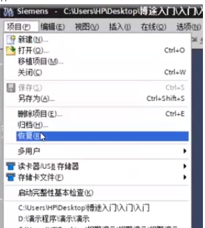打開:打開博圖v16軟件——左下角——點(diǎn) 項(xiàng)目視圖——進(jìn)去后點(diǎn)左上角菜單——項(xiàng)目——下拉菜單——恢復(fù)——選擇路徑,找到附件的 zap15_1的文件