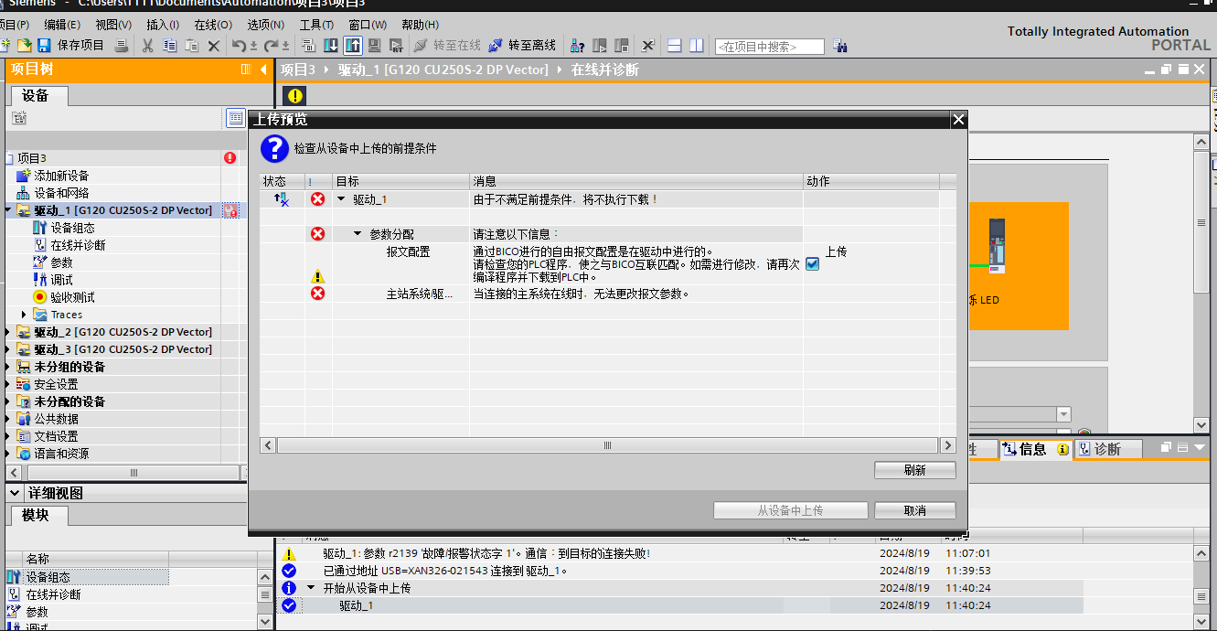 請問使用博途15.1讀取G120時可以連線的看到變頻器資訊,但無法從設備下載資料到電腦,