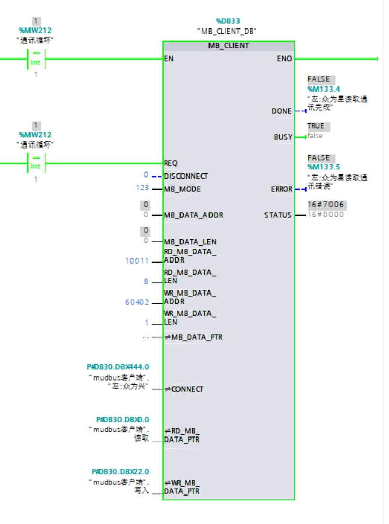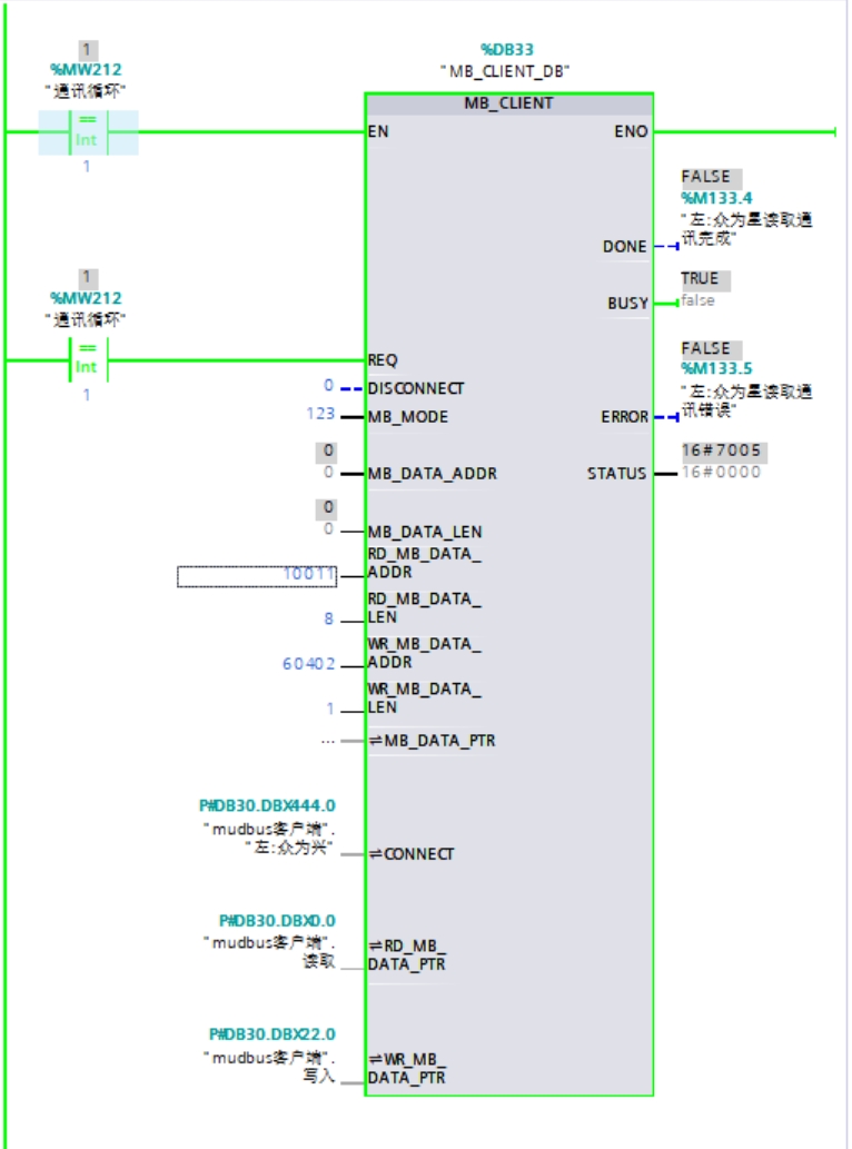 有臺1200跟眾為興做標準modbus TCP/IP協議,用的是V6的指令,需要讀和寫。然后指令提示7005和7006。幫忙看下哪里不對?