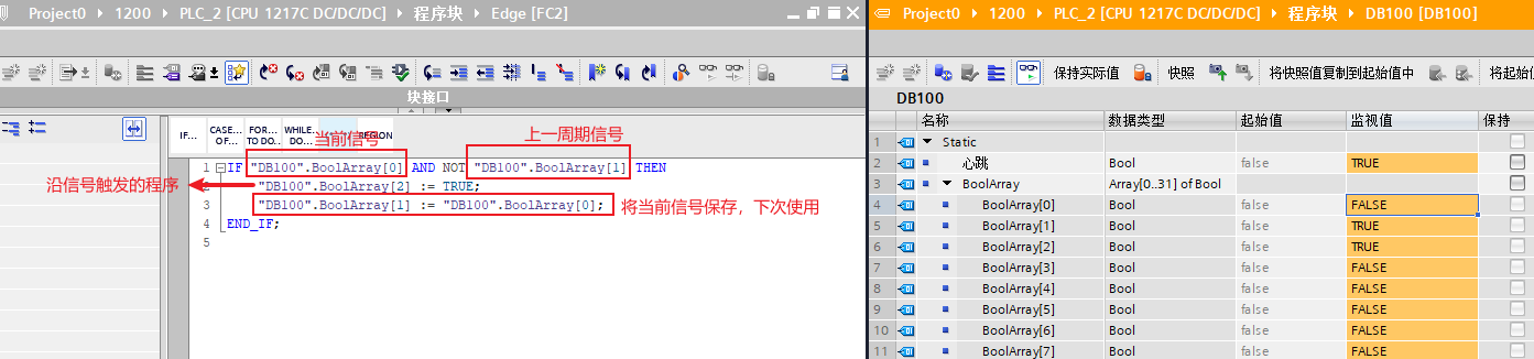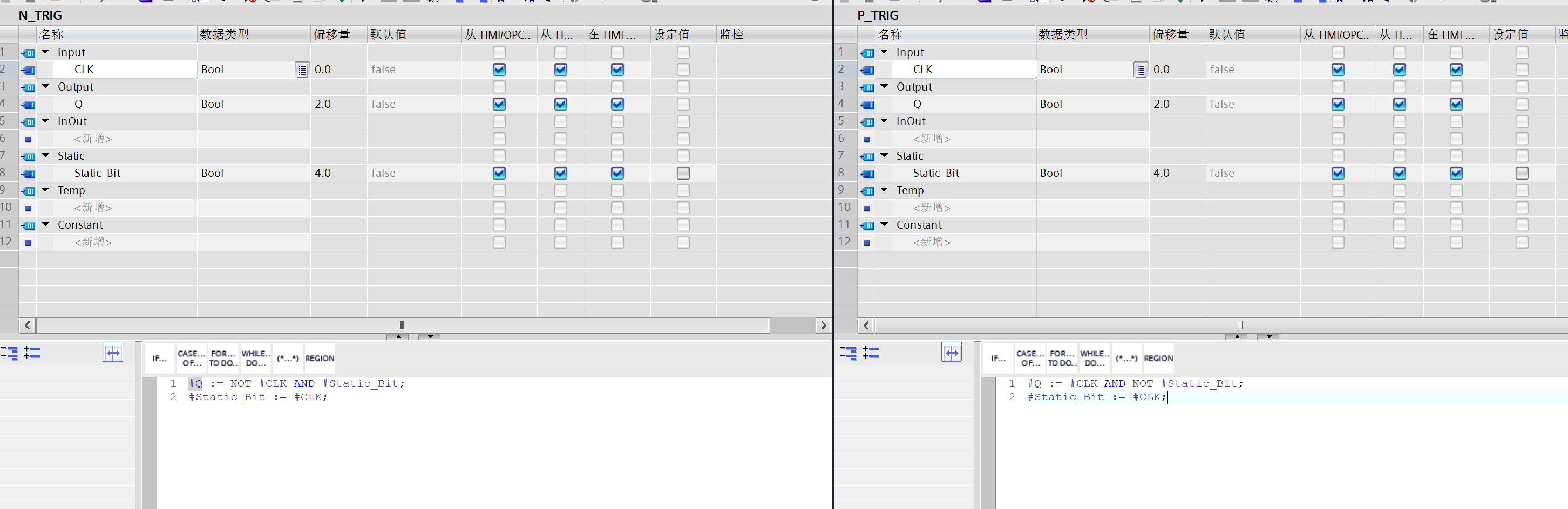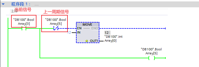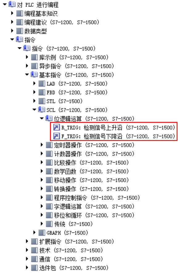 以上升沿為例,當前信號和上一周期信號閉點串聯(與運算);待處理程序處理完成后,將當前信號重新賦值給上一周期信號的存儲器中。SCL和梯形圖類似。