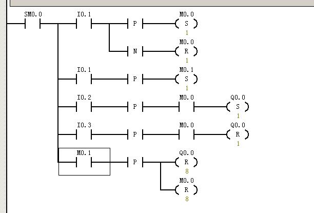 任意時刻按動I0.1的開關時,系統復位,若I0.0在開的狀態則需要關閉重新打開,系統才可以重新工作。若要鎖定復位,則只需要將M0.1替換為I0.1并且取消上升沿,則此按鈕按下,系統一直處于復位狀態,彈起時系統才可控。此程序未上機,若有問題請回帖。