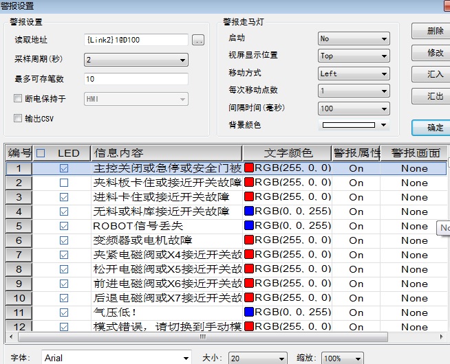 2、人機讀取D100,顯示對應的“報警設置”里的12條報警提示;