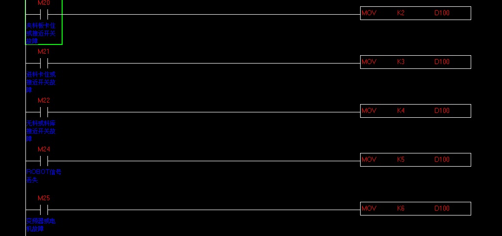 1、PLC程序根據不同的報警,將K1-K12 轉移給D100;