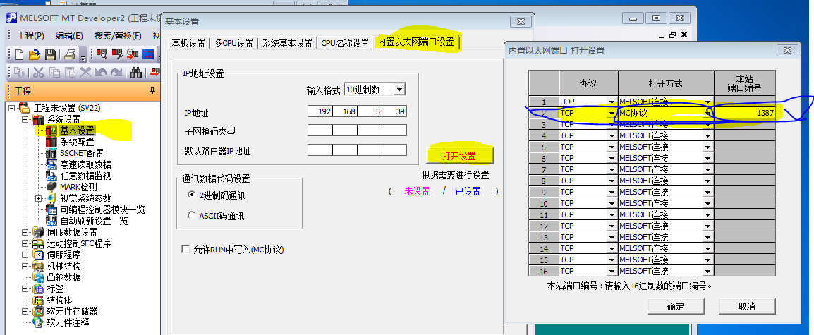 三菱運動模塊才有以太網口,打開MT,按圖設置,注意的是端口是16進制,1387才是威綸的4999,10進制;