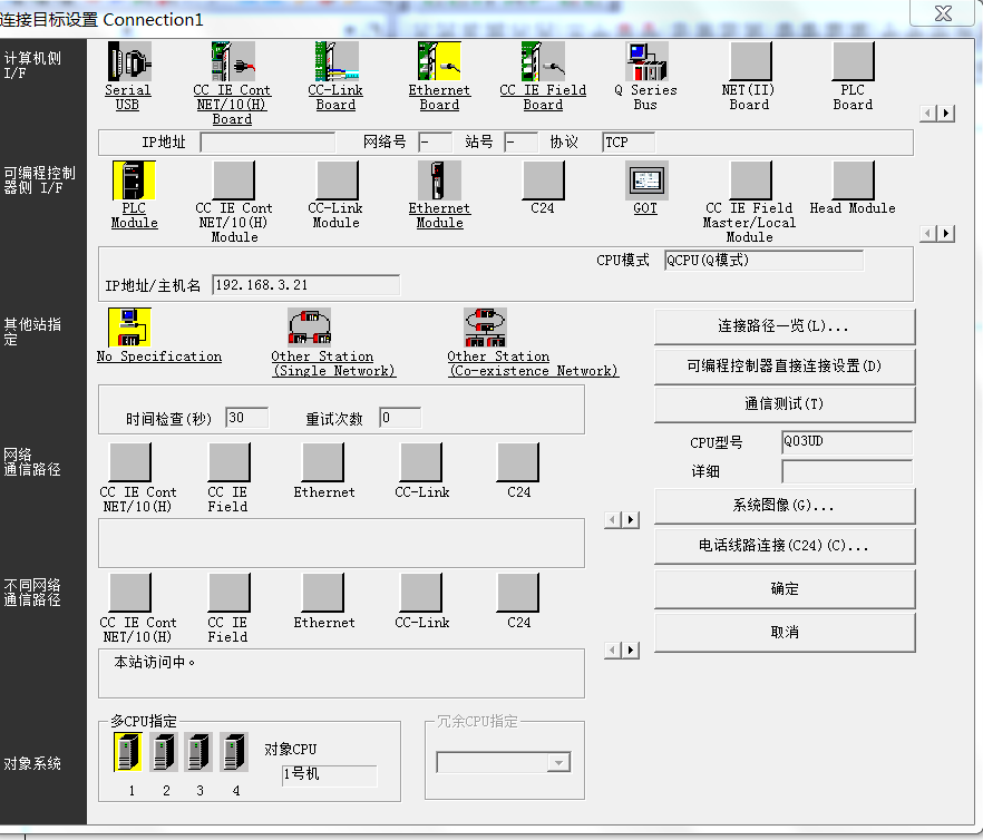 第一次使用Q170MCPU,是PLC與運動控制CPU集成那種,用三菱WORKS2可以跟PLC通訊,多CPU那里選1,可以通訊,而要設置運動CPU時,選2,用MT軟件也可以上下載程序;現在的問題是威綸通屏那里如何設置呢,看連線說明,要設網絡號,站號,都設了也無法通訊,前一個項目用的是03UDECPU跟威綸通的屏是可以用的,煩請高手指教,謝謝!