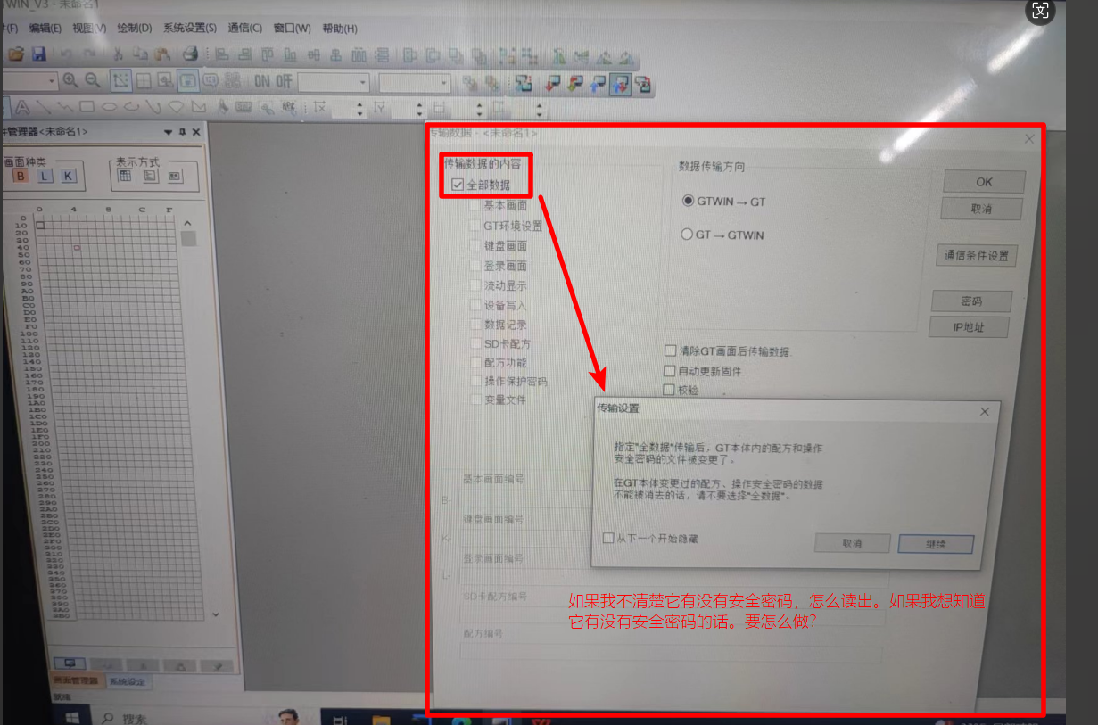 各位前輩好,松下觸摸屏GTWIN,GT707的屏讀取文件,怎么能正常讀取?如果不清楚它有沒有安全密碼的情況下,怎么確定?還有下面這種情況要怎么操作?
