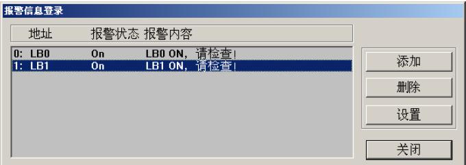 按下[報(bào)警信息登錄](méi)元件圖標(biāo),進(jìn)入報(bào)警信息登錄列表,添加2個(gè)報(bào)警信息,如下所示: