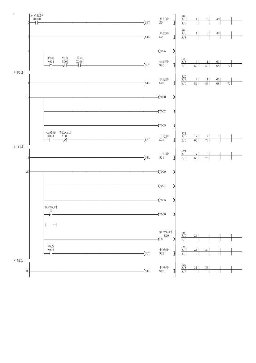 一臺液壓設(shè)備 要求動作: 原位按啟動按鈕開始快進,碰到快轉(zhuǎn)慢行程開關(guān)>>>>工進(進開始時主運動電機啟動同時潤滑電機工作4秒后停止?jié)櫥^續(xù)工進)>>>>碰終點行程開關(guān)主運動電機斷電(制動2秒)>>>>快退 碰原位行程開關(guān)停止