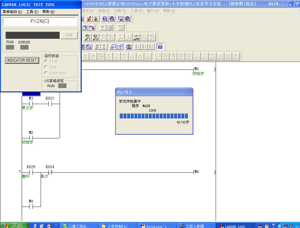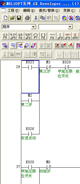2、運行GX Developer  軟件,編寫程序,注意程序中所用的X元件和Y元件的編號必須和PLC仿真模擬學習系統的意一致。(本人編了一個不帶定時器的小車控制程序,運行仿真效果很好。)