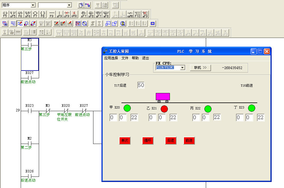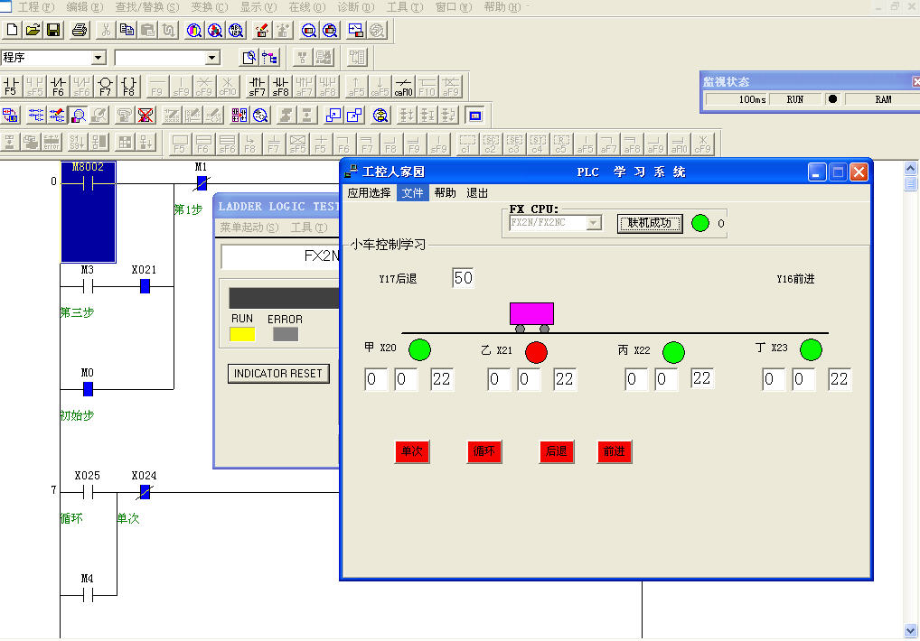 描述:啟動PLC仿真模擬學習系統,選擇小車控制學習,鼠標點擊聯機按鈕,先是聯機成功。再點擊畫面中的單次按鈕或循環、前進、后退按鈕,小車將按照設計的程序開始移動。