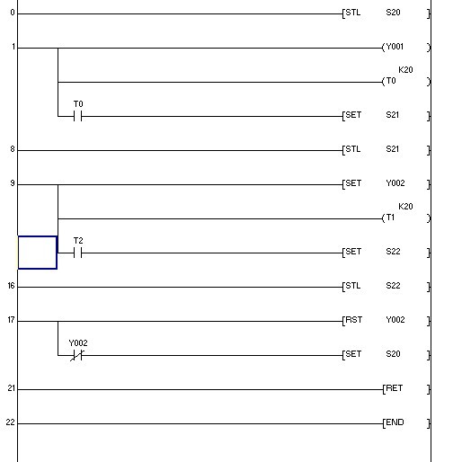 ,s21變?yōu)榛顒硬剑碮1變?yōu)镺FF Y2變?yōu)镺N,如果想讓Y1 一直有輸出只要把OUT Y1 改為SET Y1 就可以了,像SET Y2 一樣,這樣無論轉(zhuǎn)移到哪一步Y(jié)1 都為ON ,想Y1 為OFF的話在程序里加一個RST Y1 就可以了,這也就是不在程序里加RST Y2