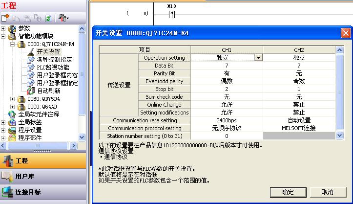 我在智能參數的《開關設置》窗口內將CH1設置為:獨立、數據位7位、校驗位有、偶校驗、停止位2位、通訊速率2400BPS、無順序協議;然后編譯下載,重啟PLC后,我登陸到QJ71C24N監視時,發現,在監視窗口中,CH1通道中顯示:獨立、數據位7位、校驗位無、奇校驗、停止位1位、通訊速率300BPS;請問如何將我想要的通訊格式下載到模塊呢?另外我也嘗試用模式切換:將Y2置1,但是模塊報錯:7E54,就是說EROM改寫被設定為禁止;后來我在開關設置里將onlinechange 和 更改設置 都設定為允許,但還是報錯,請問這個問題如何能解決呢?謝謝!