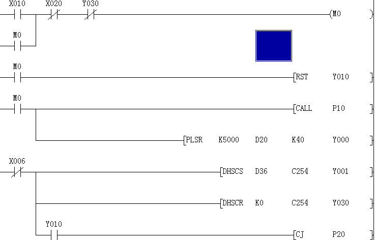 我大概的思路是 啟動X010,然后先給驅(qū)動器一個正轉(zhuǎn)信號(因為驅(qū)動器要求先有控制信號再有脈沖信號),然后調(diào)用子程序計算脈沖后輸出脈沖到Y(jié)000來驅(qū)動步進電機移動,當?shù)竭_指令的脈沖,也就是從觸摸屏輸入的位移到達后,立即給一個反轉(zhuǎn)信號即Y010,然后再調(diào)用脈沖計算子程序,再返回到原點,當?shù)竭_原點后自動斷開Y030,停機