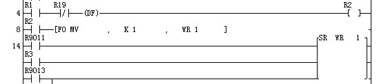 第二行的F0 MV等于MOV,就是把K1傳送支WR1中,WR1是R10--R1F的集合,R10為低位。在三菱里好像是K4M0