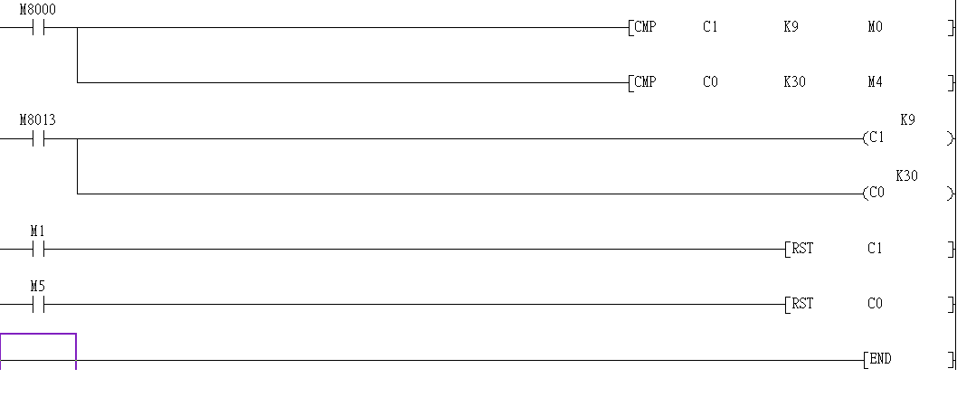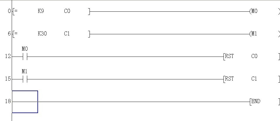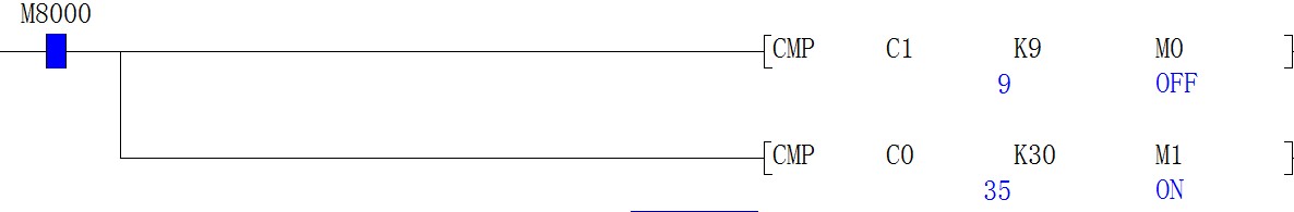 引用引用第1樓匯榮鋁業(yè)于2012-11-30 09:27發(fā)表的 :你輸入的格式都不對(duì),CMP指令自動(dòng)占用3點(diǎn)的軟元件M0.M1,M2也就是大于,等于,小于。第一行已經(jīng)占用了M0到M2了。你第二行又出現(xiàn)了M1,程序運(yùn)算都出錯(cuò)了。第一行當(dāng)C1等于9時(shí)M1就已經(jīng)接通了,根本等不到等于30。