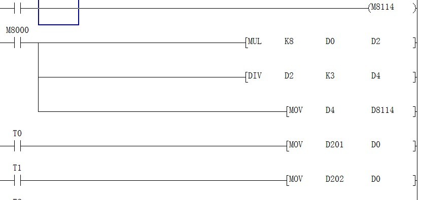 當寫入D201 D202數值時 T0和T1分2個時斷分別把D201 D202數值傳給D0,D0的數值經過運算寫到D4寄存器