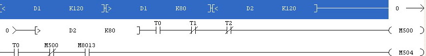 就是條件指令,D1/D2都滿足大于80,小于120,才能使M500  ON