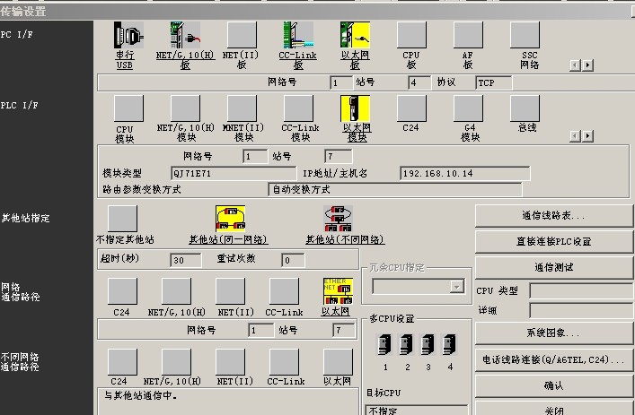 請教各位師傅:我剛學PLC,在電腦里編好程序,并設置好網絡參數,見圖1、2,用數據線USB-QC30R2成功將程序寫入PLC,見圖3,后回控制室用臺式機通過網線來連接PLC的以太網模塊,設置見圖4、5、6,可怎么也通訊不上,見圖7,不指什么原因,我已把臺式機IP地址設為192.168.10.11,不清楚臺式機的網絡號和站號應該怎么設,見圖4,是不是只要保證站號不和PLC的站號一樣就OK了?硬件回路應該沒有問題,因為用組態軟件通過網線能和PLC正常通訊,