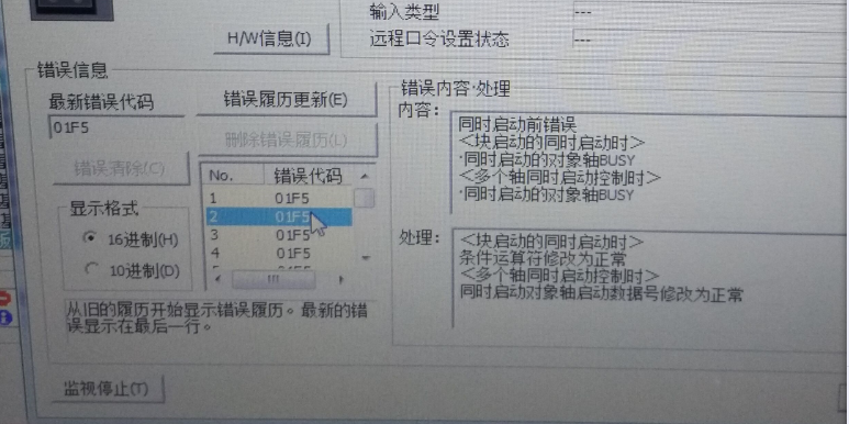 各位路過的高手,我這里有一臺設備。有QD75MH2和QD75MH4兩個定位模塊。有兩個伺服頻繁出現,在循環加工過程中在原始位停止不動且無報警的現象。在用軟件監控的時候選擇軟件里的系統監控。發現兩個模塊都有黃色嘆號。報警信息顯示01F5。描述是:同時啟動的對像軸忙。解決方法:同時啟動對像軸啟動數據號修改為正常。這個號我知道在軟件里,可怎么設置呢?必須設置嗎?我的微信183406168望指教。