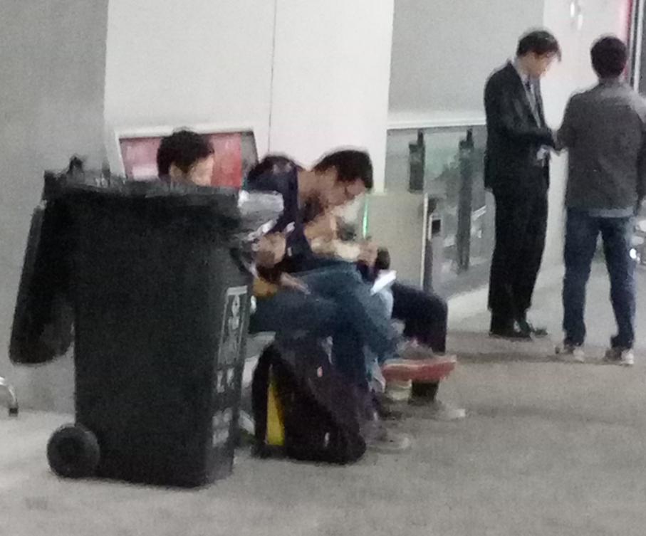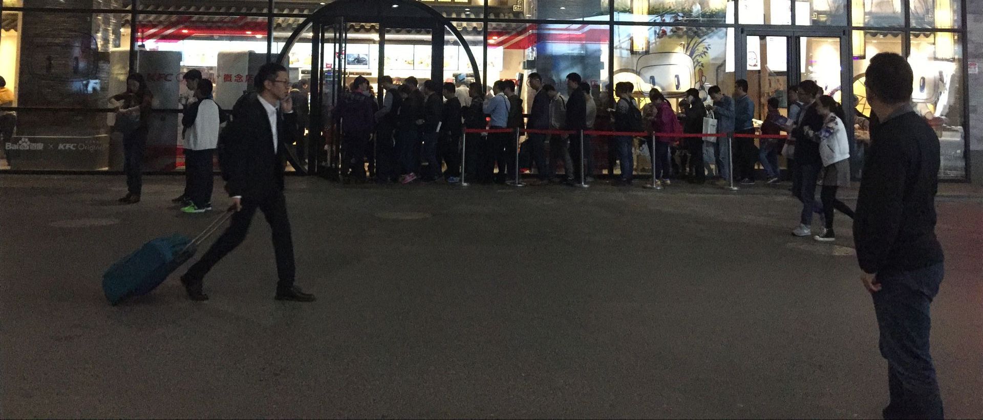 二是拖著裝滿資料的另一位小哥從肯德排隊人群前淡然離去