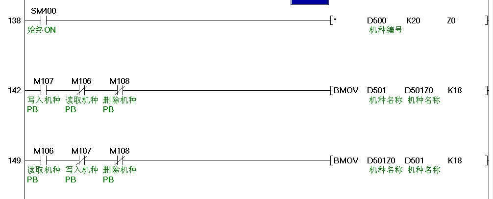 D500存儲編號,D501~D518 存儲第1個機種(配方)的信息;D521~D538 存儲第2個機種(配方)的信息……