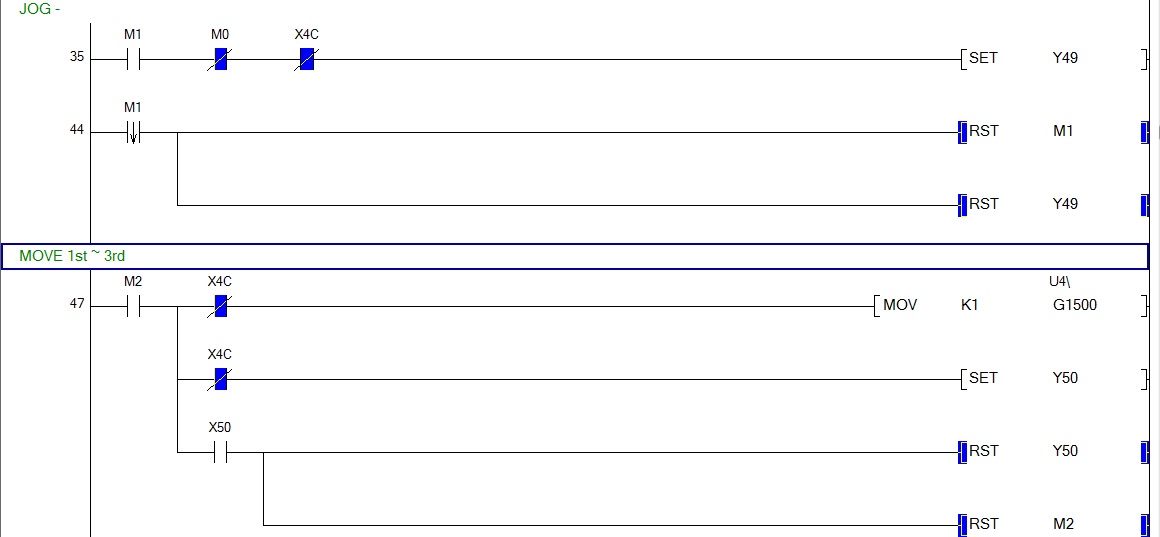 JOG用點動一行過就行了,不用置位那么麻煩的。定位M2一般不在這里復位,釆用定位結(jié)束信號復位,這樣程序才能知道伺服的位置。正常情況下,定位啟動置位,啟動完畢信號就跟著有,這時再復位定位啟動,就是LD Y50,AND X50,RST Y50