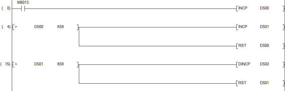 M10接通時,每秒D520加1,夠60,清零同時D521加1,D521夠60,清零同時D522加1,