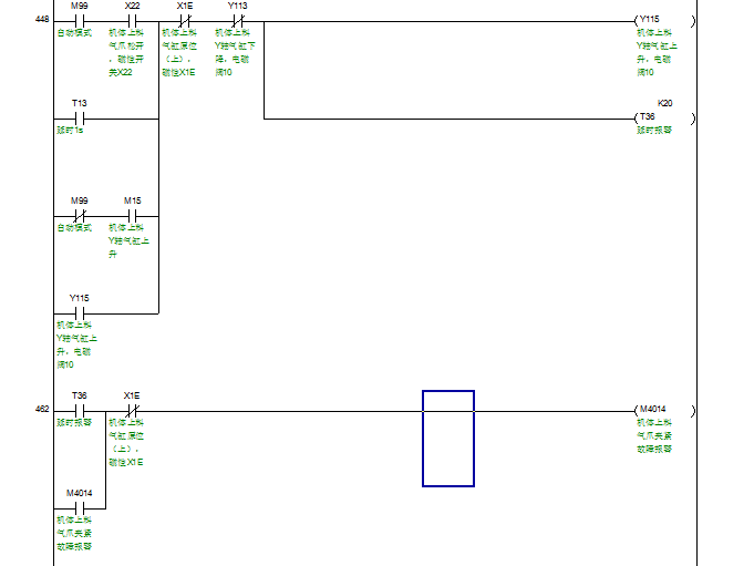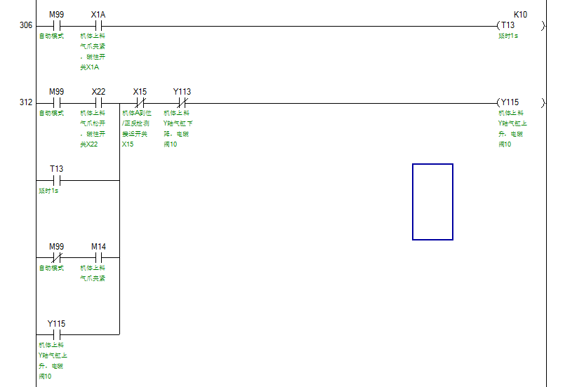 這是之前的動作控制梯形圖。M99自動模式下,當X1A夾緊機體后,T13開始計時。計時1S時間到后,Y115得電并自鎖,Y軸氣缸開始上升直至氣缸上升到位,此時繼電器X15得電,常閉觸點斷開,Y115失電,氣缸停止上升。現在就是想編梯形圖,使得Y軸氣缸由于故障未能到達上位時報警并在觸摸屏上顯示出來。FX系列有超時報警指令ANS,Q系列沒有相應指令,所以不知道要怎么寫梯形圖