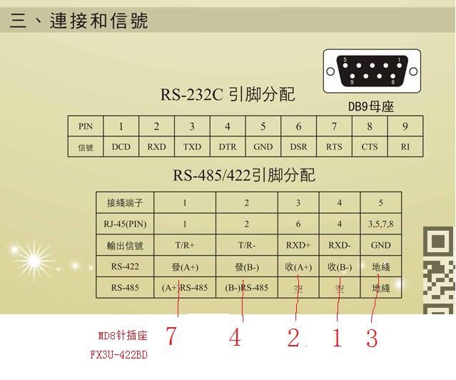 幫忙看下用RS232轉422這樣接線對不對,謝謝了,紅色是422BD8針圓口的針腳號