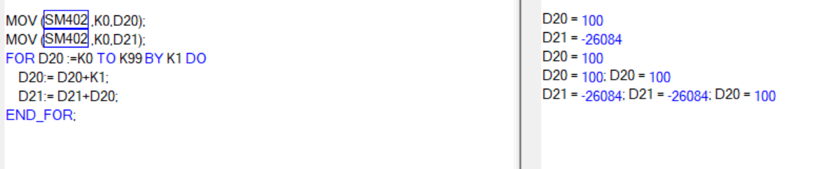引用引用第9樓楓落云端于2017-11-16 09:53發(fā)表的 :以上是M0 為ON時執(zhí)行一次循環(huán),如果只是想PLC開機自動算一次,那就變成MOV (SM402 ,K0,D20);MOV (SM402 ,K0,D21);IF SM402 THEN FOR D20 :=K0 TO K99 BY K1 DO.......